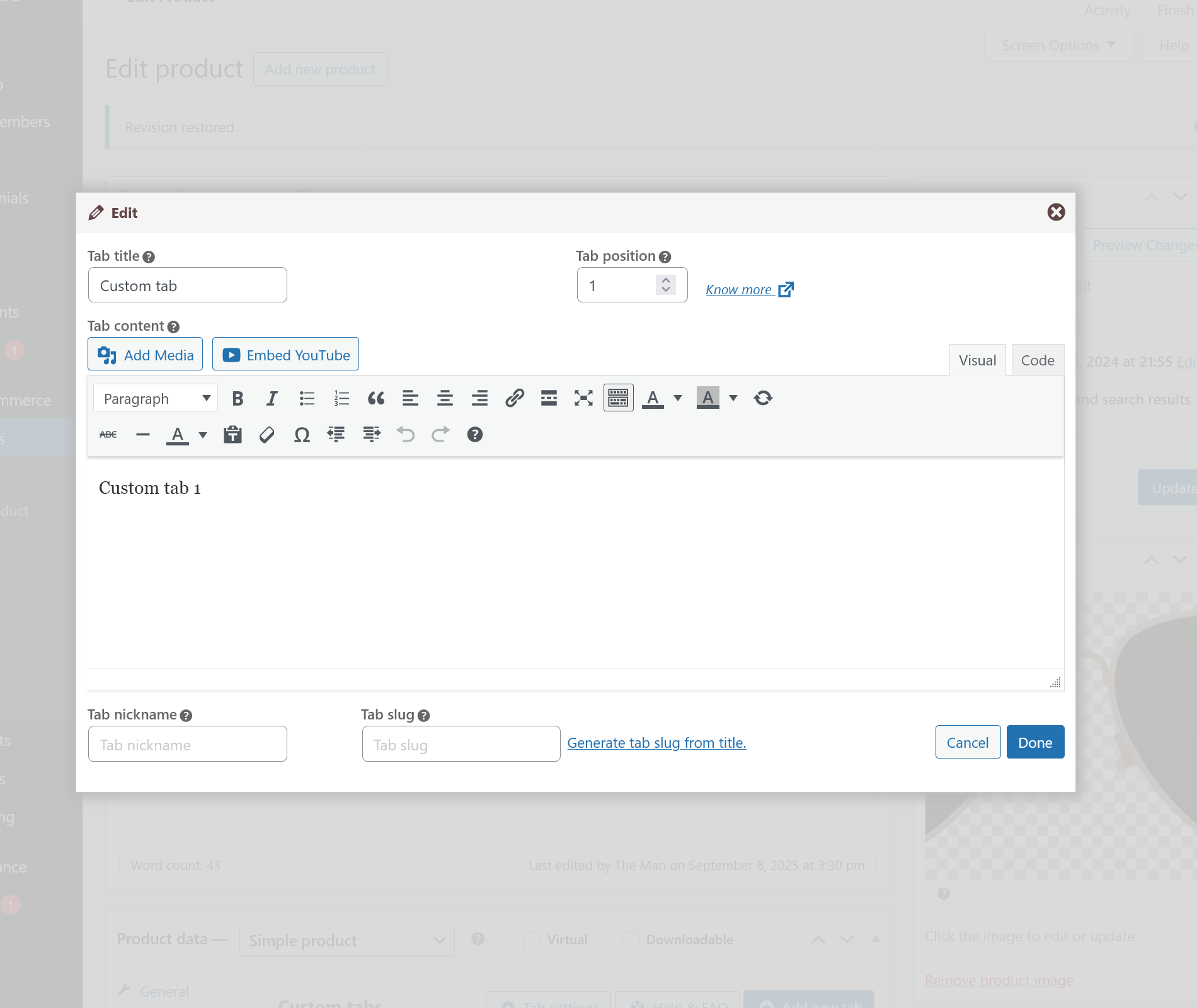 The Product Tabs addon allows you to create product tabs for products in your WooCommerce store.